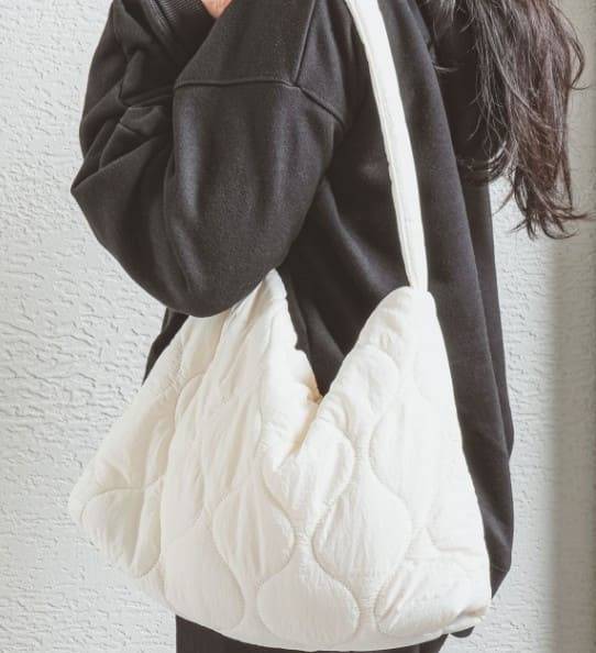 마지막으로 소개할 가방은 패딩처럼 포근하고 따뜻한 사각 퀼팅 호보백입니다. 수납공간이 넉넉해서 책, 파우치, 태블릿 등 많은 물건을 여유롭게 담을 수 있다는 장점이 있는데요. 지퍼 잠금도 있어서 물건이 쏟아질 걱정도 없고, 내부에 이중 포켓이 있어서 작은 물건도 깔끔하게 정리할 수 있어답니다. 크로스백, 숄더백 모두 가능해 활용도가 좋은데요. 특히 이 큰 사이즈 덕분에 겨울 외출할 때 필요한 물건을 한 번에 쓸어 담기도 좋은 가방입니다.