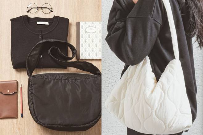 마지막으로 소개할 가방은 패딩처럼 포근하고 따뜻한 사각 퀼팅 호보백입니다. 수납공간이 넉넉해서 책, 파우치, 태블릿 등 많은 물건을 여유롭게 담을 수 있다는 장점이 있는데요. 지퍼 잠금도 있어서 물건이 쏟아질 걱정도 없고, 내부에 이중 포켓이 있어서 작은 물건도 깔끔하게 정리할 수 있어답니다. 크로스백, 숄더백 모두 가능해 활용도가 좋은데요. 특히 이 큰 사이즈 덕분에 겨울 외출할 때 필요한 물건을 한 번에 쓸어 담기도 좋은 가방입니다.