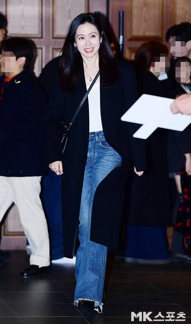 특히, 허리 라인을 강조하지 않은 롱 코트와 부츠컷 데님 조합은 자연스러운 우아함을 돋보이게 했습니다.