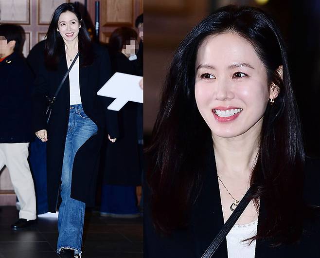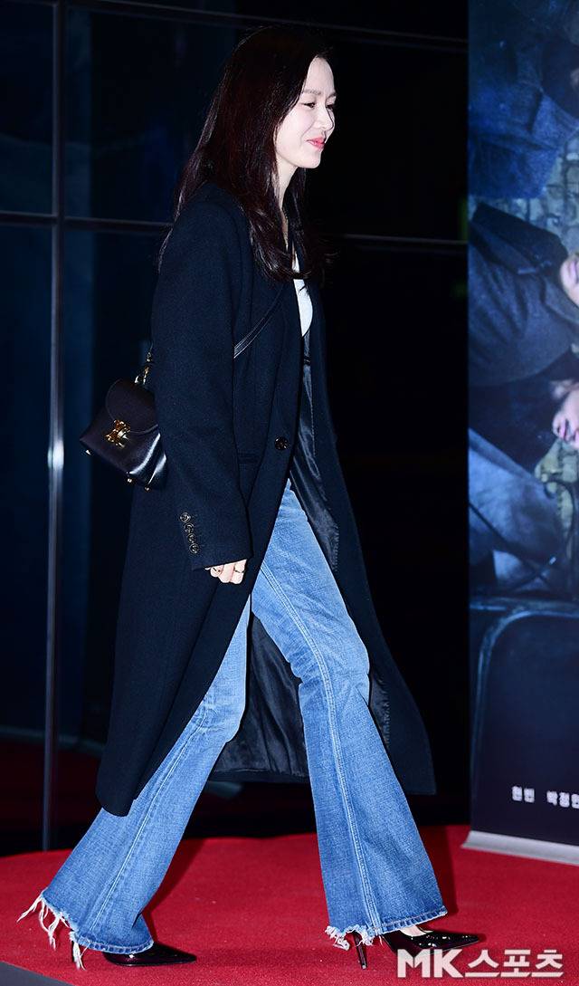 손예진은 깔끔한 네이비 롱 코트에 화이트 톱과 데님 플레어 팬츠를 매치해 캐주얼하면서도 고급스러운 스타일링을 선보였습니다.