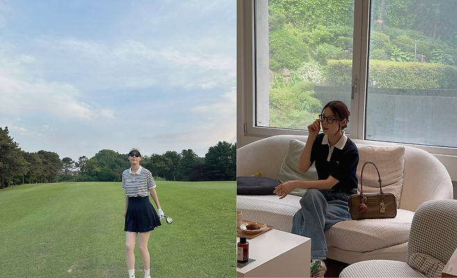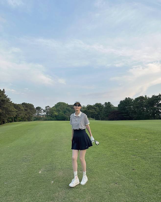 스트라이프 폴로셔츠와 네이비 플리츠 스커트의 클래식한 골프웨어 조합을 선택했다. 화이트 골프화와 양말로 스포티한 완성도를 높였으며, 선글라스와 캡으로 기능성과 스타일을 동시에 잡았다. 깔끔한 컬러 배색이 활동적이면서도 우아한 분위기를 만들어내고 있다.
