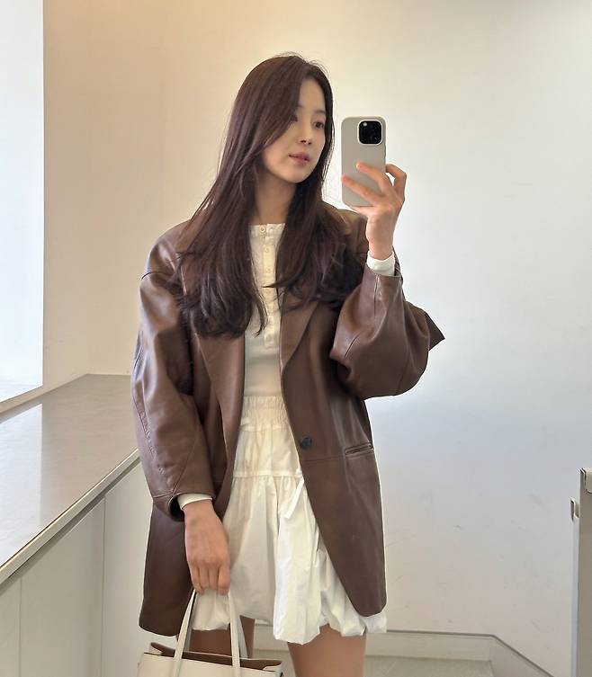 한지혜는 브라운 톤 오버사이즈 재킷과 화이트 원피스를 레이어드한 세련된 룩을 연출하고 있다. 깔끔한 화이트 원피스 위에 여유로운 실루엣의 브라운 재킷을 매치해 모던하면서도 편안한 분위기를 자아내고 있다. 특히 재킷의 오버사이즈 핏이 트렌디함을 더하며, 전체적으로 미니멀한 컬러 팔레트로 세련미를 극대화했다.