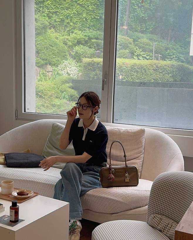 네이비 폴로셔츠와 라이트 블루 데님의 클래식한 프레피 룩을 완성했다. 화이트 칼라 디테일이 포인트가 되는 폴로셔츠와 편안한 핏의 데님 팬츠가 일상적이면서도 단정한 매력을 발산한다. 브라운 핸드백과 안경으로 지적이고 세련된 분위기를 더해 완성도 높은 스타일링을 연출하고 있다.