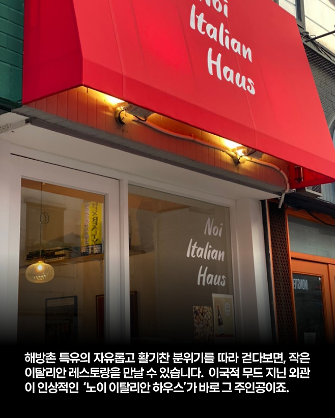 해방촌 특유의 자유롭고 활기찬 분위기를 따라 걷다보면, 작은 이탈리안 레스토랑을 만날 수 있습니다. 마치 이탈리아 소도시에 위치한 정겨운 가게처럼 보이는 이국적 무드, 친절한 스텝들과 맛있는 요리가 있는 '노이 이탈리안 하우스'가 바로 그 주인공이죠.