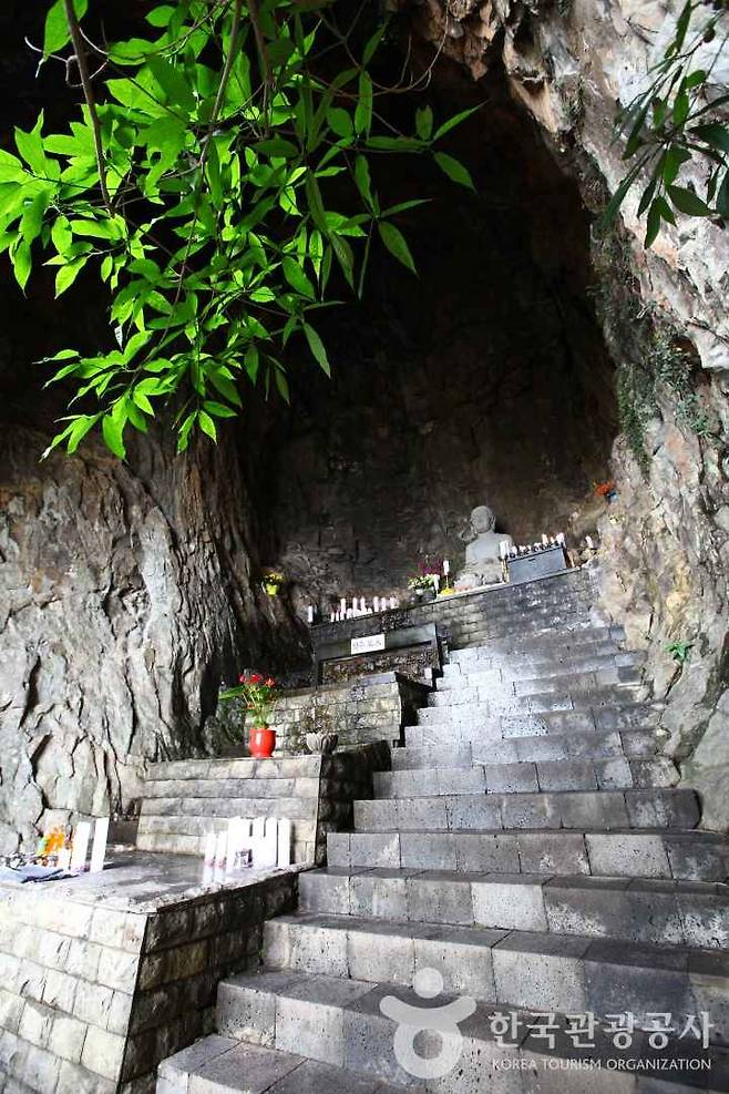 서귀포시 안덕면, 산방산 중턱 해발 150m 지점에 자리한 산방굴사는 자연이 만든 해식동굴 안에 자리한 독특한 사찰입니다.