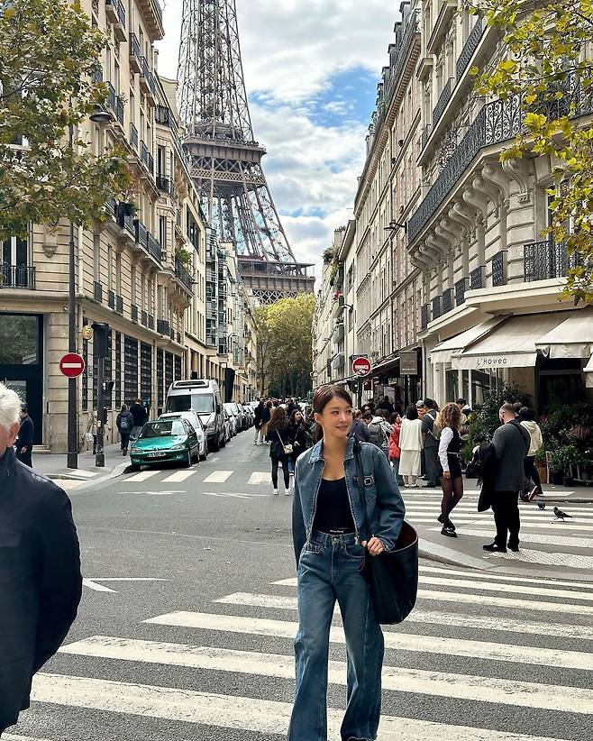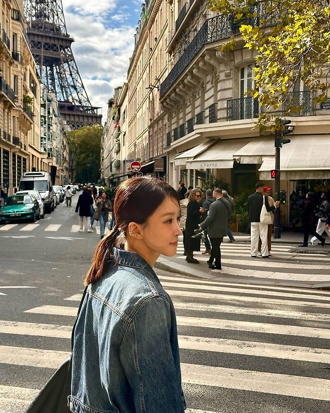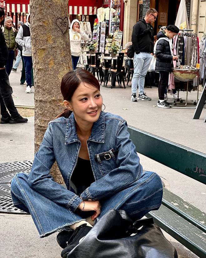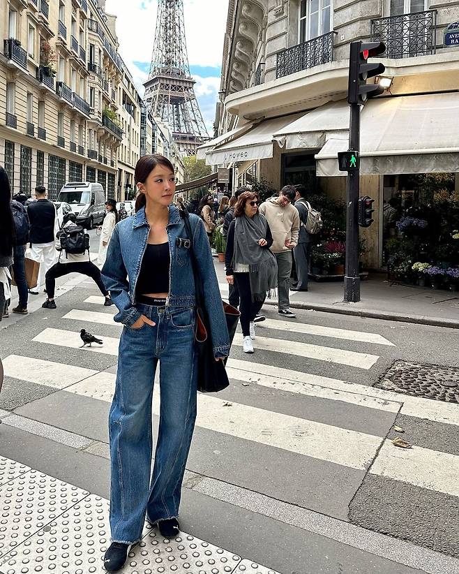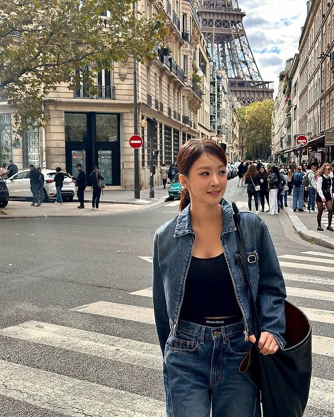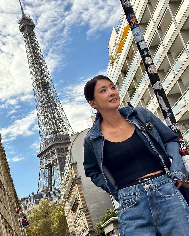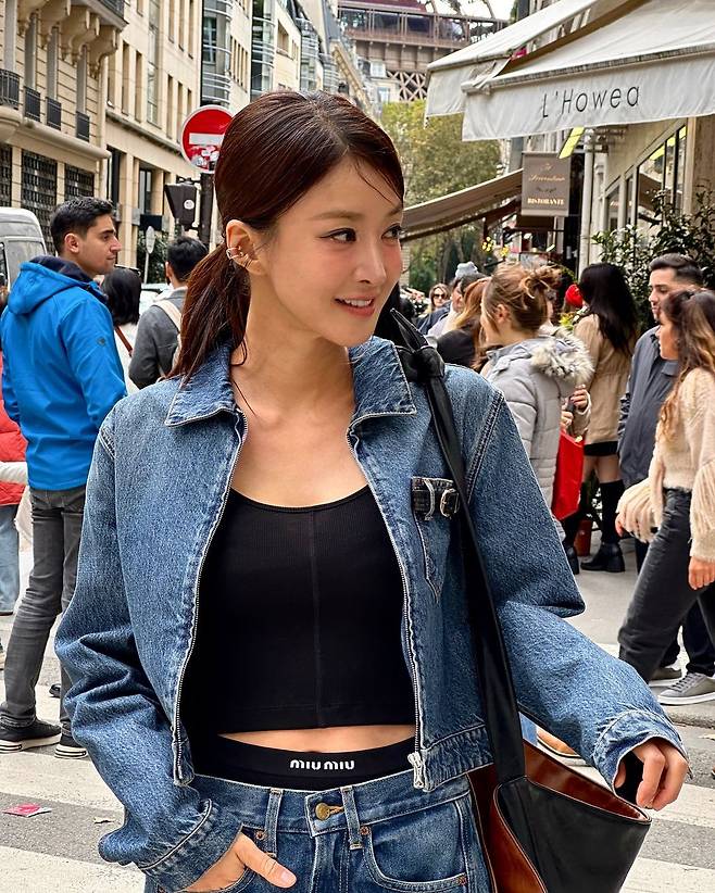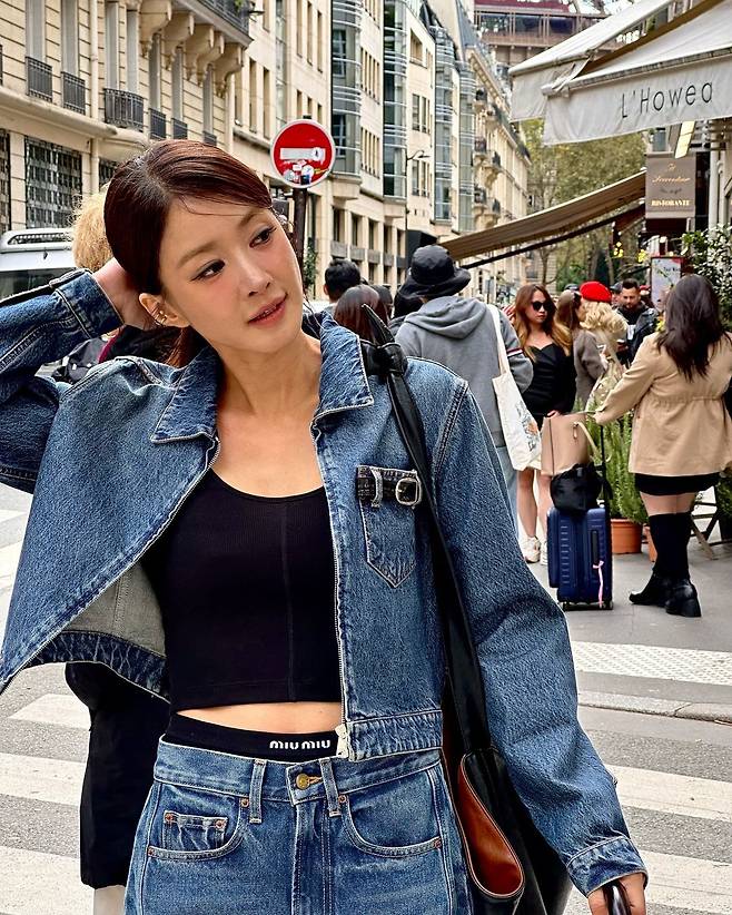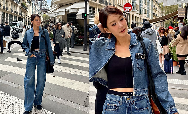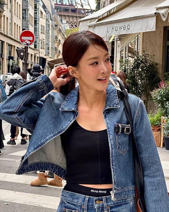사진 속 이시영은 블랙 크롭티를 입고 청 크촙자켓과 청바지를 입어 청청 패션을 선보였다. 로우 포니테일을 하여 시크한미를 더욱더 선보이며 날씬한 복근을 자랑했다.