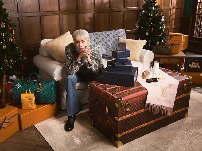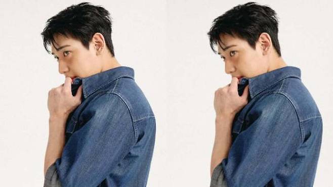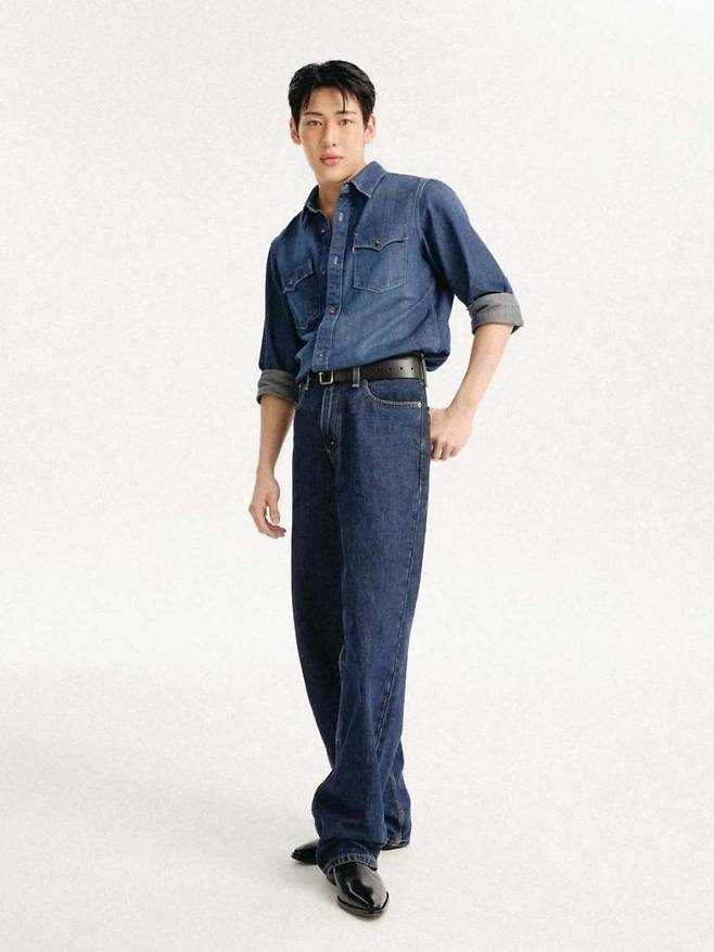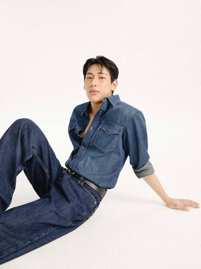 두 번째 룩은 데님 셔츠와 청바지를 함께 입은 ‘청청 패션’이다. 상의와 하의가 같은 소재로 연결돼 통일감이 느껴지며 자연스러운 멋이 살아 있다. 뱀뱀은 짙은 인디고 색의 셔츠를 선택해 소매를 팔꿈치까지 걷었고, 셔츠 앞주머니와 스티치 라인이 포인트가 된다.