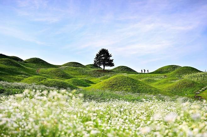 천년 고분군과 샤스타 데이지의 만남이라니, 상상만 해도 근사하지 않나요? 대구 불로동고분군은 유네스코 세계유산으로 등재된 유서 깊은 곳인데요. 봄이 되면 고분 사이로 하얗게 피어난 샤스타 데이지가 고즈넉한 분위기를 더욱 특별하게 만들어줍니다.