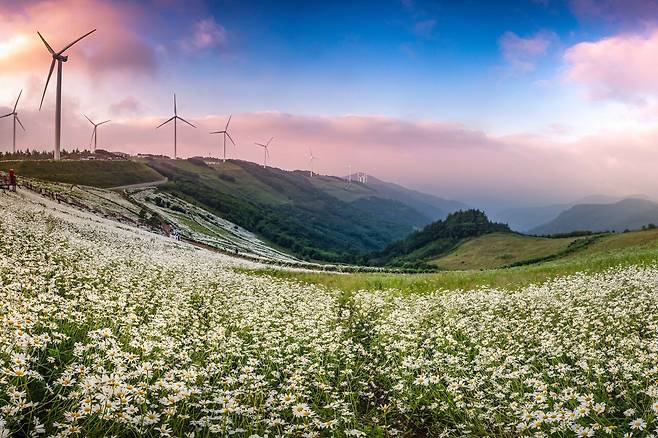 강원도 푸른 고원 위, 샤스타 데이지가 바다처럼 펼쳐지는 곳, 바로 평창 육백마지기입니다. 해발 1,256m에 자리한 평창은 여름이면 하얀 샤스타 데이지가 초원을 가득 메워 마치 구름 위를 걷는 듯한 느낌이 드는데요. 풍차와 함께 드넓게 펼쳐진 샤스타데이지가 상당히 매력적입니다.