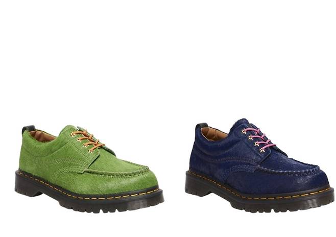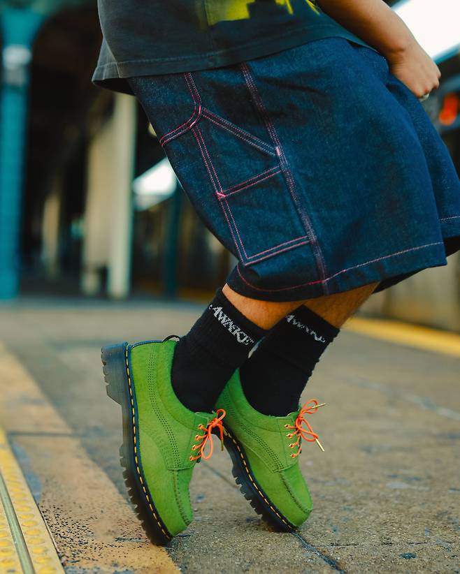 닥터마틴 X 어웨이크 뉴욕 컬렉션의 4홀 로웰 슈즈는 바이브런트 그린과 피오니 네이비 컬러의 헤어온 가죽에 'AWAKE NY' 로고가 새겨진 대조적인 블랙 오일 가죽 백스트랩이 돋보이는 특징을 가지고 있다고 해요