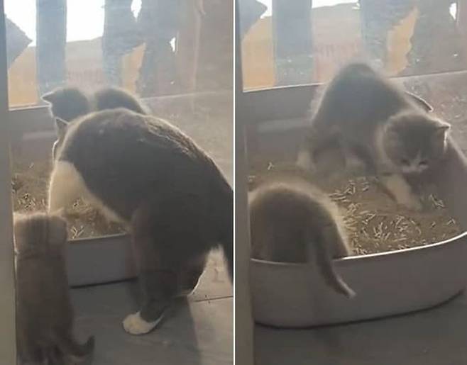 엄마 고양이는 앞발로 모래를 파고 덮는 모습을 아기 고양이들 앞에서 손수 시범을 보였죠. 그렇다면 아기 고양이들은 어떤 반응을 보였을까.