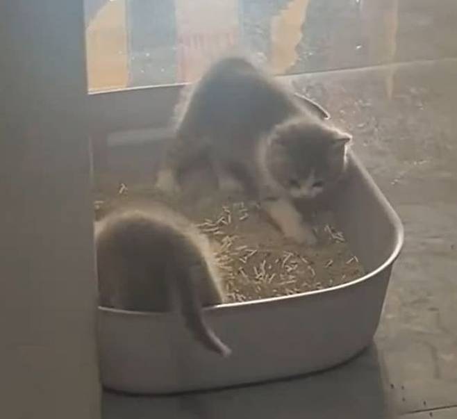 호기심 가득한 아기 고양이들은 모래 화장실을 보고 흥분을 가라앉히지 못했는데요. 엄마 고양이는 아기 고양이들 보는 앞에서 화장실 파묻는 모습을 보여줬습니다.