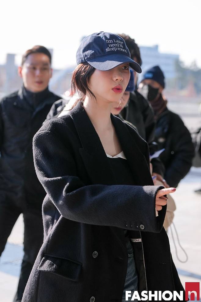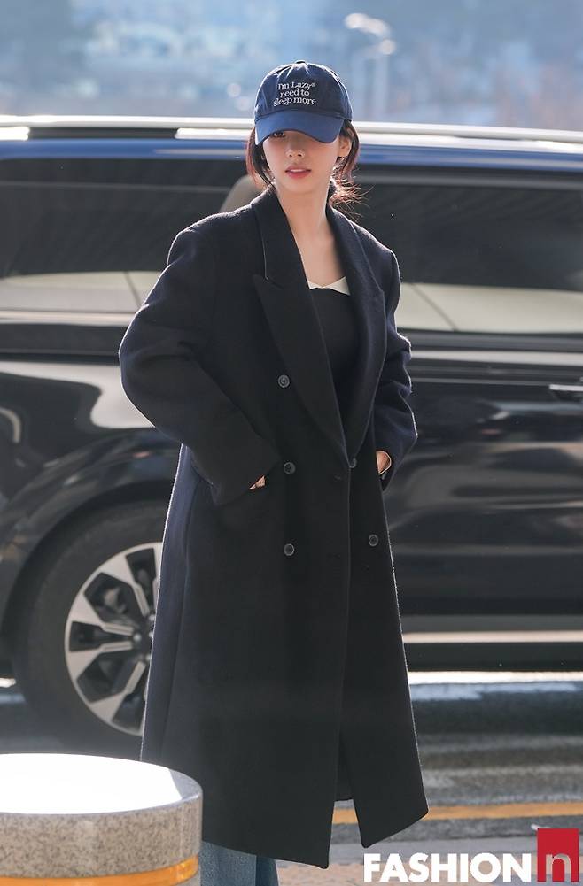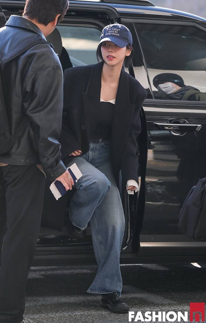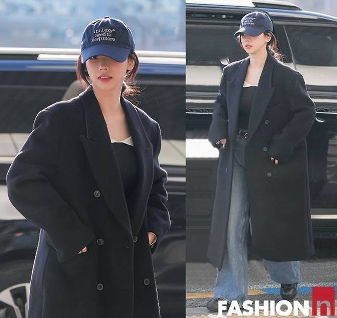이날 카리나는 와이드 핏 데님 팬츠에 클래식한 블랙 더블 버튼의 롱 코트를 입고 볼캡을 매치한 출국룩으로 클래식하면서도 힙한 미모를 드러냈다.