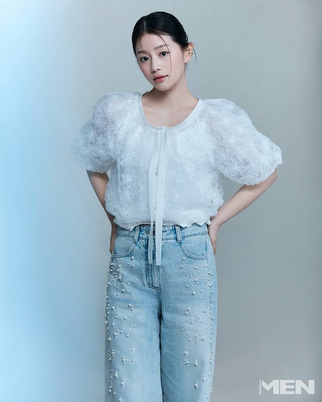 채서안은 화이트 시퀸 블라우스와 펄 장식 데님 팬츠로 세련된 캐주얼 룩을 연출하고 있다. 볼륨감 있는 퍼프 슬리브와 반짝이는 시퀸 디테일이 로맨틱한 분위기를 자아내며, 하의의 펄 장식이 포인트가 되어 전체적으로 우아한 느낌을 완성했다.
