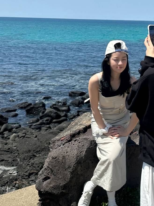 해변에서 선보인 베이지 톤 원피스 룩은 자연스러운 매력을 강조하고 있다. 화이트 캡과 함께 매치한 미니멀한 스타일링으로 여름철 휴양지 패션의 정석을 보여주며, 편안하면서도 세련된 분위기를 연출하고 있다.