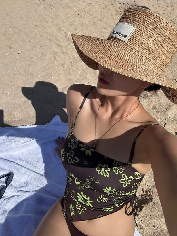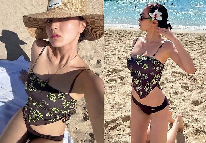 지효는 플라워 패턴의 밴디지 톱과 브라운 하이웨이스트 비키니 팬츠를 매치해 건강미 넘치는 실루엣을 강조했습니다.