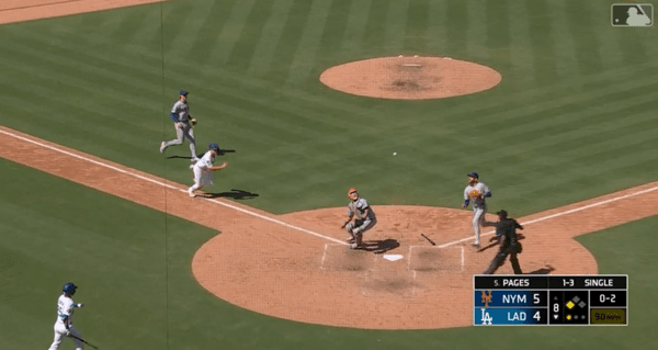 그러나 메츠는 더 큰 '미스'로 우세를 잃어버렸다. 8회 말 등판한 리드 개럿이 윌 스미스에게 좌전 1타점 2루타를 맞았다. 이어 테오스카 에르난데스의 깊숙한 중견수 뜬공으로 주자가 3루로 나갔다.