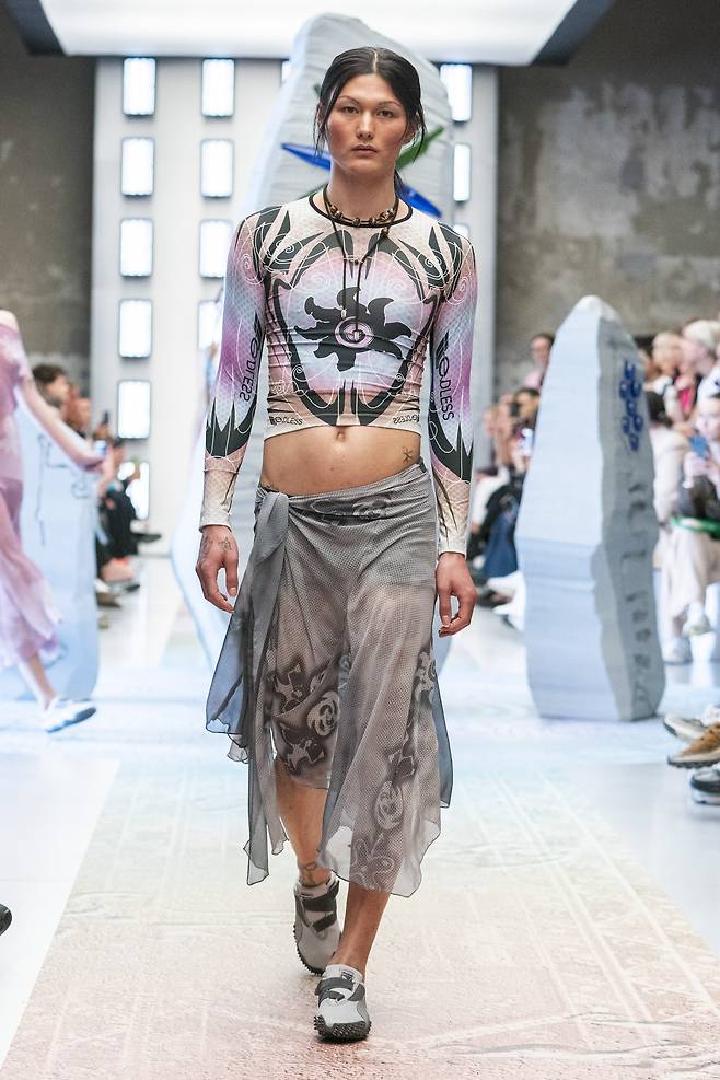 2024년 봄-여름 컬렉션에서 루소와 길마드르는 에이브버리에 있는 스톤 서클과 로이스턴 동굴에 있는 벽화에 주목해, 어린 시절 길바닥에 분필로 그리곤 하던 그림과 연결 지었다. “우리는 수천 년 전과 행동을 공유하게 하는 집단의식(collective consciousness)에서 영감을 얻었다.” 루소의 말이다. 이들이 쇼에서 선보인 파스텔 톤의 민속적인 드레스와 니트, 데님은 룬 문자를 연상시키는 아트워크로 돋보였다. 나무 토글로 장식한 셔링 크롭 탑 룩은 북유럽 신화 책에 등장할 법하다.