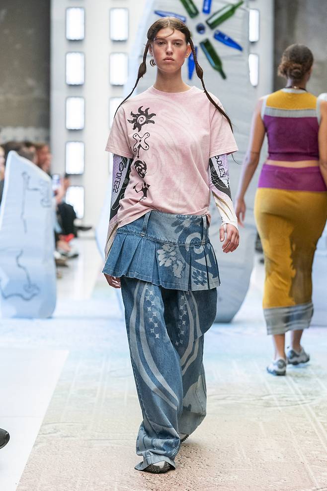 그다음엔 잘란도 비저너리(Zalando Visionary)에서 수상한 파올리나 루소(Paolina Russo), 루실 길마르드(Lucile Guilmard) 듀오의 선조로부터 이어받은 듯한 룩이 있었다. 파올리나 루소의 민속적 스타일은 브랜드의 장인 정신과 본질적으로 어우러진다. 이들의 특기는 니트웨어다. “니트는 대대로 내려온 공예 기법이다.” 루소의 말이다. 이들은 주로 울과 오가닉 코튼을 쓰고 하드웨어는 좀처럼 쓰지 않는다. 길마드르가 설명하기를 “일종의 순환 같은 거다. 자연에서 나온 섬유를 써서 입는 사람을 배려하고, 다시 자연으로 돌려보내는 거다.”