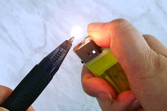그러면 아까 전만 해도 나오지 않던 볼펜이 잘 나오더라고요. 라이터를 활용해 촉에 굳은 잉크를 녹여 볼펜을 나오게 하는 원리랍니다.