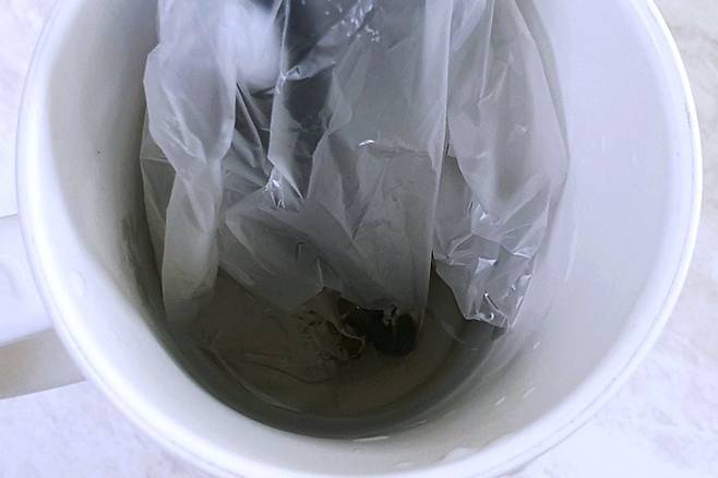 그다음 안 나오는 볼펜을 비닐봉지에 담아 따뜻한 물에 10분 정도 담가주세요.