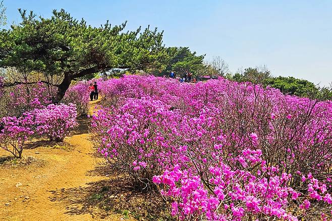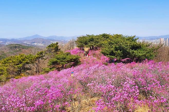 도심과 가까워 접근성도 좋고, 산세가 완만해 가족 단위 나들이객도 부담 없이 오를 수 있어 더욱 매력적이다. 특히 4월 중순이면 정상 부근과 능선을 따라 흐드러지게 핀 진달래가 장관을 이룬다.