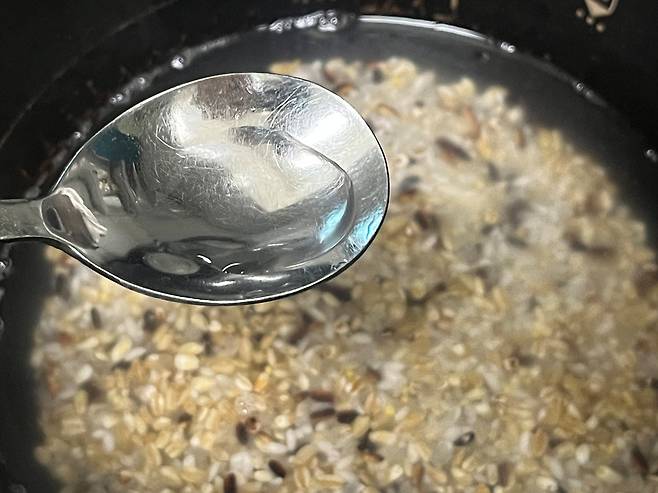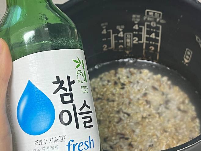 2~3인분 분량의 경우 소주를 반 큰 술 정도만 살짝 넣습니다. 소주를 넣으면 밥이 부드럽게 되고, 잡곡의 눅눅한 잡내를 잡는 효과도 있습니다.