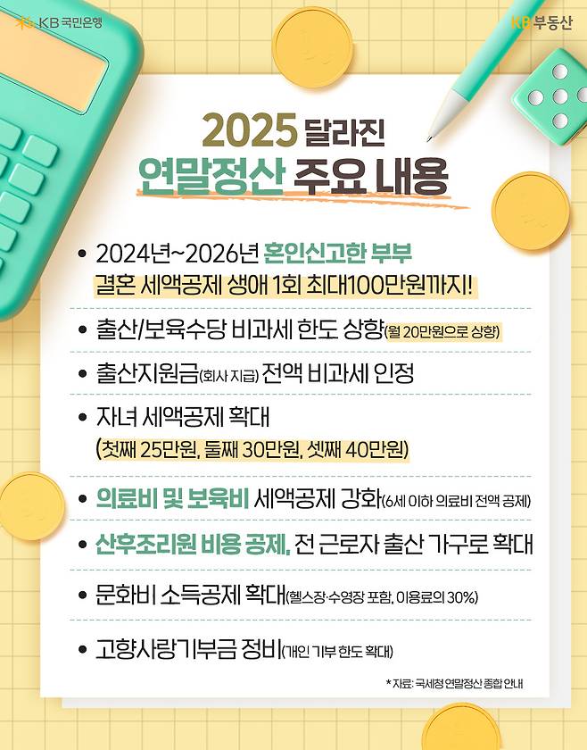2025년도 어느새 다 지나 가고 연말정산을 준비할 때가 다가왔습니다. 일명 ‘13월의 월급’을 되도록 많이 챙길 수 있는 방법에는 어떤 것이 있을까요? KB부동산이 실질 환급·절세를 노릴 수 있는 ‘꿀팁’을 정리해 드립니다.