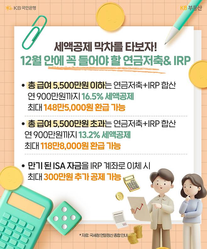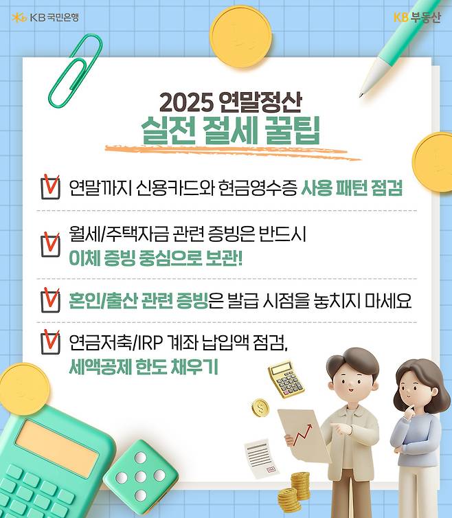 2025년도 어느새 다 지나 가고 연말정산을 준비할 때가 다가왔습니다. 일명 ‘13월의 월급’을 되도록 많이 챙길 수 있는 방법에는 어떤 것이 있을까요? KB부동산이 실질 환급·절세를 노릴 수 있는 ‘꿀팁’을 정리해 드립니다.