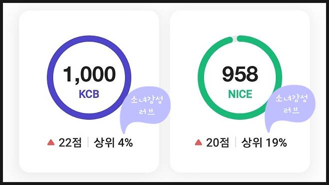 몇주만에 다시 신용점수를 확인했더니 KCB 신용점수가 1000점이라고 나왔어요.