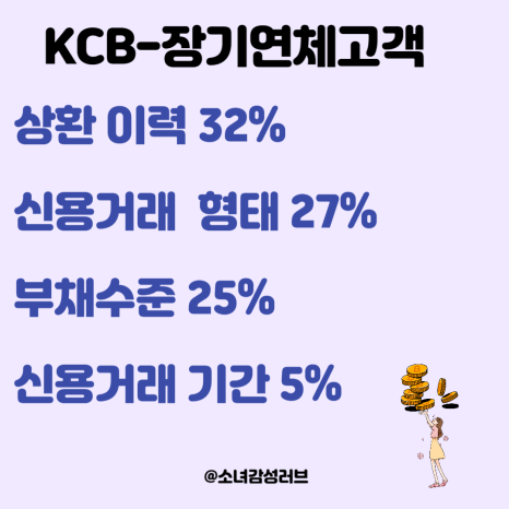 KCB는 장기 연체를 한 적이 있는 고객인지 아닌지에 따라 평가 항목의 비중이 달라져요.