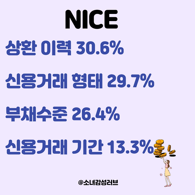 NICE는 신용을 평가할 때 위 순서대로 중요하게 봅니다.