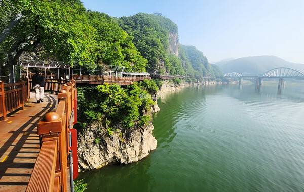 단양 남한강을 둘러싸고 있는 웅장한 암벽 아래 조성된 단양강 잔도입니다. 총길이 1.2km에 이르는 단양강 잔도는 평탄한 나무 데크길로 조성되어 있어 짜릿하고 웅장한 자연 아래 가벼운 트래킹을 즐기기 좋은데요. 중간중간 그늘막이 설치되어 있어 햇빛이 강한 낮에도 반짝이는 남한강 옆 산책을 즐기기 좋습니다.
