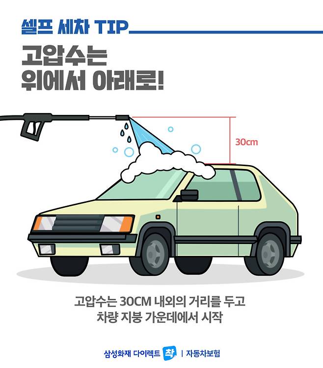 모든 세차 작업은 대부분 위에서 아래로 진행됩니다. 고압수를 뿌릴 때도 차량 지붕 가운데에서부터 시작해 아래쪽으로 내려오면 됩니다. 고압수는 30cm 정도 거리를 두고 뿌리는 것이 좋은데, 너무 짧으면 고압수가 세서 페인트에 손상이 생길 수 있고 그 이상 멀어지면 효과가 떨어지니 적정 거리를 유지하는 것이 좋습니다. 또한, 휠과 타이어를 세척할 때는 동그랗게 원을 그리면서 뿌려주면 깔끔하고 빠르게 세척할 수 있습니다.