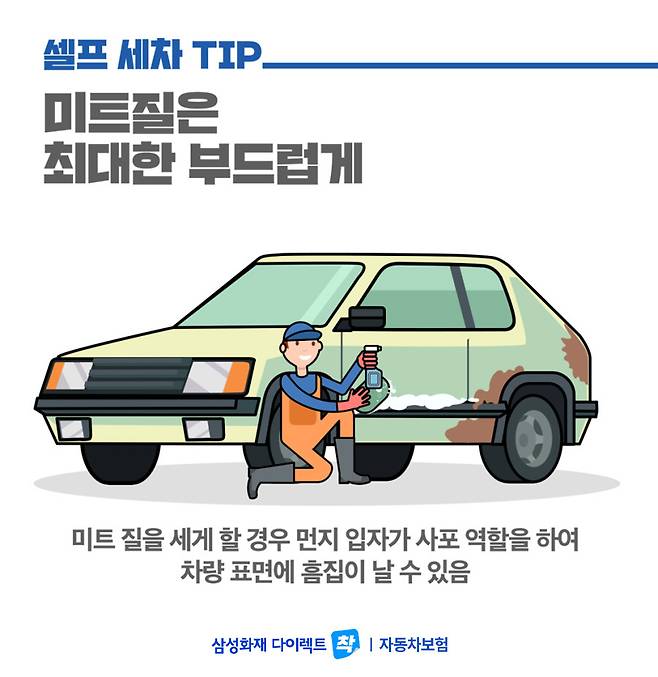보통 세안을 할 때도 거품을 사용해 부드럽게 닦아내는 것이 좋듯, 세차 시 미트 질을 할 때도 최대한 부드럽게 하는 것이 좋습니다. 오염물질 속에는 흙과 먼지, 그리고 다양한 중금속들이 포함되어 있기 때문에 조심스럽게 털어내지 않으면 먼지 입자가 사포 역할을 하여 차량 표면에 흠집을 유발할 수 있습니다.