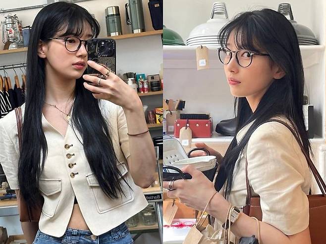 수지는 세련된 크롭톱 패션에 긴 생머리를 늘어뜨린 청순한 긱시크 패션을 연출했다. 트렌디한 크롭톱 패션 그 자체로도 패션을 완성할 수 있지만 '괴짜미'를 더해 개성넘치는 패션을 완성했다. 뿔테안경을 써도 벗어도 트렌디한 패션이다.