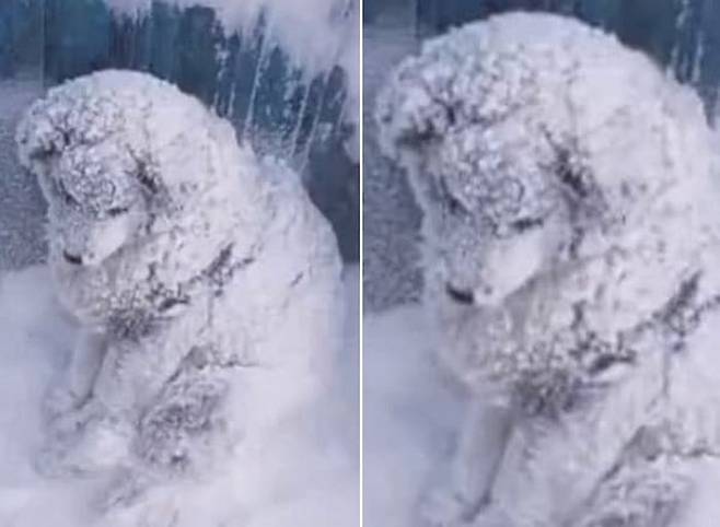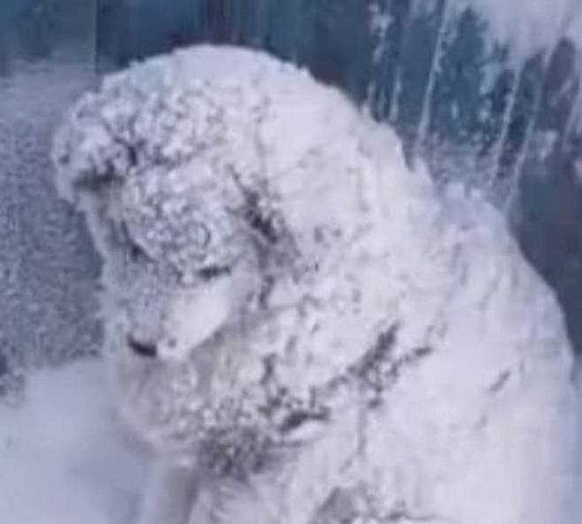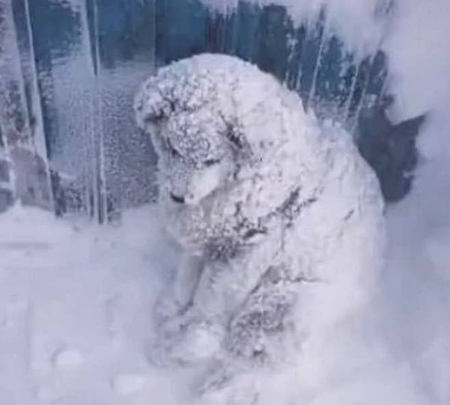 온몸을 바들바들 떨면서 주인이 사라진 곳을 바라보는 강아지는 어떤 심정이었을까요. 그렇게 강아지의 온몸에는 눈이 뒤덮히기 시작했고 어느새 눈사람처럼 눈이 뒤덮히고 말았죠.