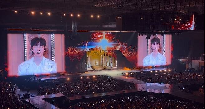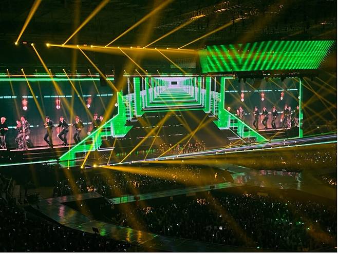 이어서 첫 곡 <MAMA> 무대가 시작되었다. 최신곡으로 공연의 서막을 알리는 여타 콘서트의 전형적인 구성과 달리, 그들은 14년 전 발매된 데뷔곡을 선택한 것이다. 오프닝으로 <Crown>을 예상했던 필자의 짐작과는 정반대의 행보였다. 엑소의 정체성이 담긴 곡답게 웅장한 사운드가 도입부를 채우자마자 공연장은 터질 듯한 함성으로 가득 찼다. 데뷔 당시를 떠올리게 하는 이 무대는 긴 세월을 함께해 온 팬들에게 깊은 울림과 향수를 선사하기에 부족함이 없었다.