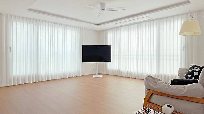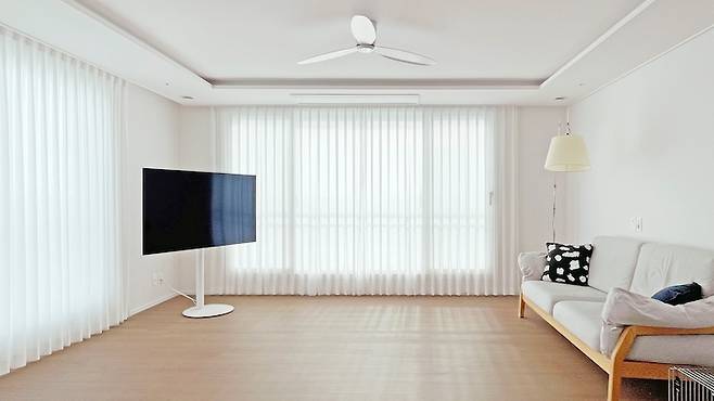 탁 트인 모습에 반한 집이라 최대한 아무것도 없이 시원한 거실을 만들고 싶었어요. 그래서 티비장을 없앴고 티비도 없애야 하나.. 어떻게 할까 고민하다가 빌티니 티비 스탠드 구입했습니다. 질릴 때마다 위치 이리저리 옮겨가며 쓰면 좋을 거 같아요.