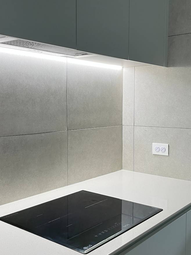 조명은 조리대 부분을 기준으로 타공등을 배치하고 인덕션 쪽은 화기를 다루는 공간이라 더 잘 보여야 할 거 같아서 상부장 아래 백색 라인등을 달았습니다.