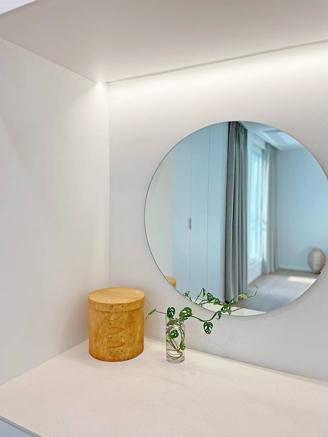 침실에서 제일 마음에 드는 부분이 바로 화장대인데요. 하얗고 네모네모 해서 차가운 느낌이 드는 거 같아 포인트로 원형 거울을 달았는데 동글동글한 오브제가 하나 있어주니 차가운 느낌이 완화되는 거 같더라고요 :)