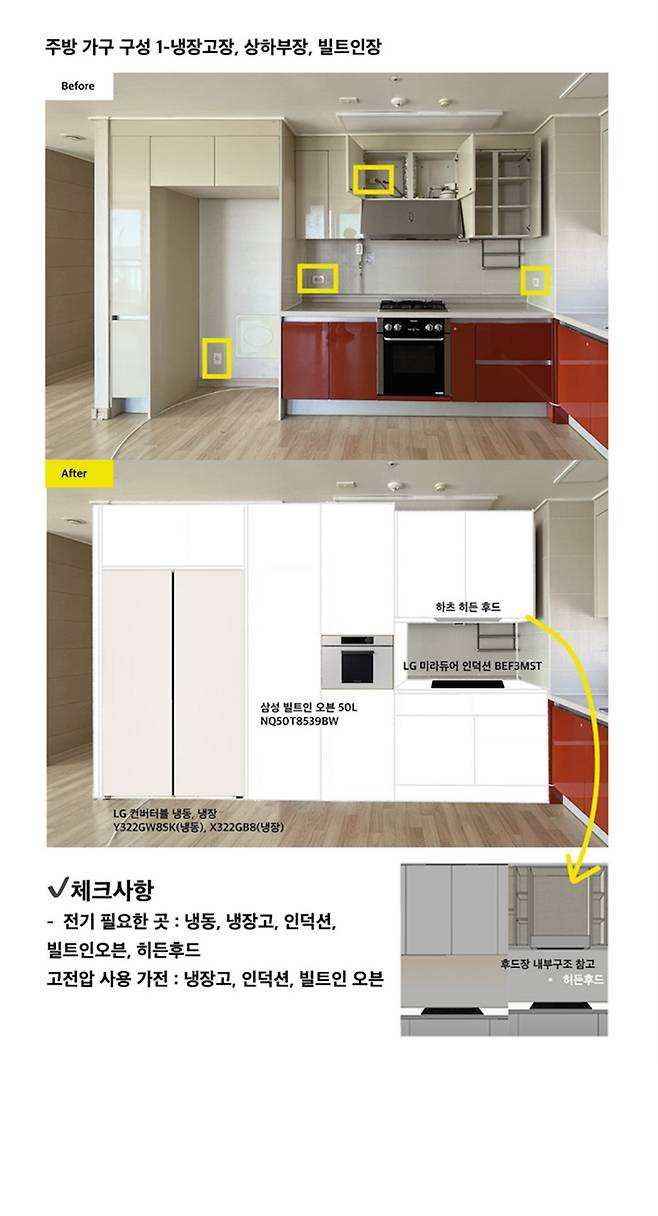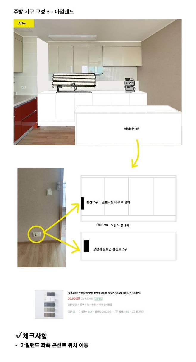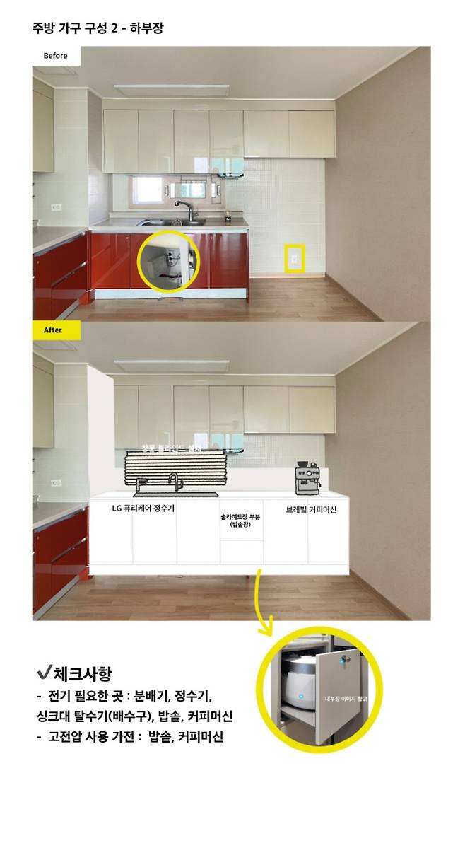 콘센트 위치를 미리 파악한 후 커피 머신을 어디에서 주로 사용할 지 고민해보고 빌트인 콘센트 위치도 미리 잡아뒀습니다. 그리고 빌트인으로 구입하기 어려운 가전 중 하나인 밥솥은 주방 가구 계획을 할 때 오늘의집에 스크랩 해뒀던 이미지를 참고하여 저희 집도 숨겨뒀어요~!