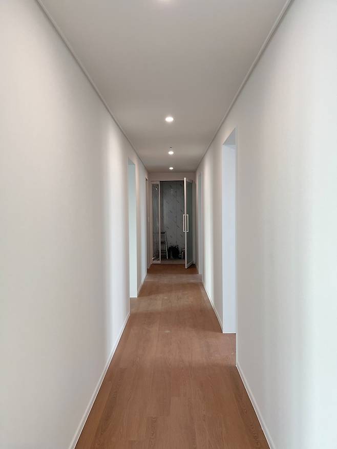따뜻한 느낌을 주기 위해 바닥은 마루로 선택했습니다. 고를 때 색감과 사이즈 고민을 많이 했는데 완성된 모습을 보니 만족스러워요. 기존에 자주 보던 마루들은 노란빛?이 많이 돌고 좁은 사이즈에 광택이 있었어요. 상태가 나쁘지는 않았지만… 이번 인테리어 전반적인 느낌에 맞도록 노란 빛이 덜 나고, 넓어 보이는 효과가 있는 광폭 마루를 골랐습니다.