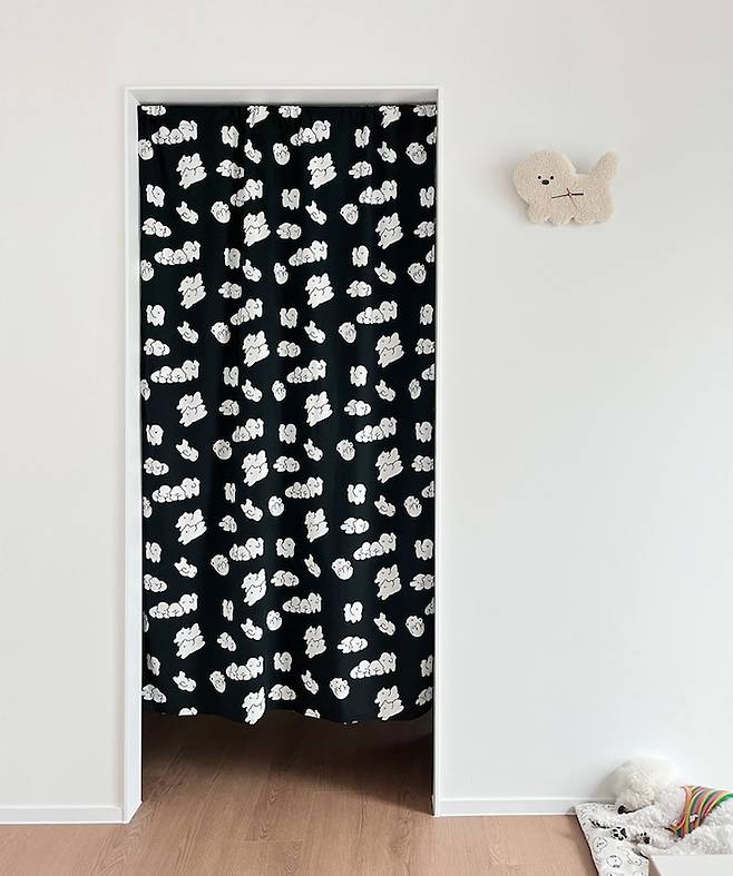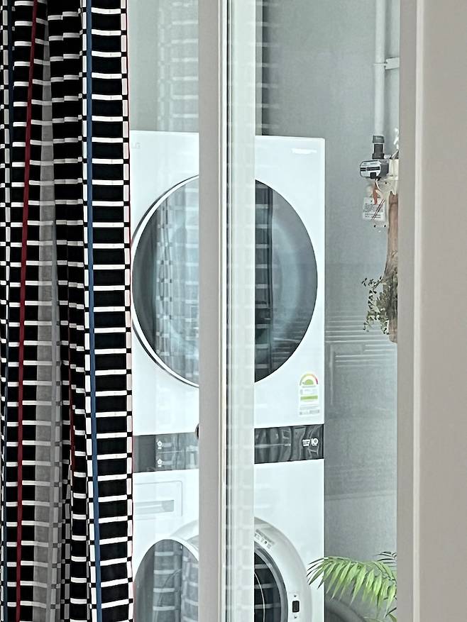 세탁실로 연결되는 창문에 동일하게 블라인드를 설치할지 커튼을 달지 고민했어요. 블라인드는 자주 드나드는 공간이라 불편할 거 같아서 커튼으로 결정하고 기왕이면 좀 색다르게 연출하면 어떨까 싶어서 과감하게 패턴이 있는 커튼을 달았습니다. 심심하다 싶은 집에 포인트가 된 거 같아요.