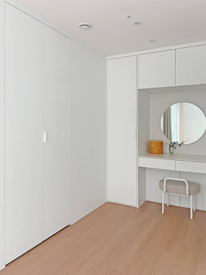 안방은 기존 구조에 있던 팬트리 위치에 시스템 장을 짜서 수납을 만들고 가구를 최소화했어요. 전신 거울을 이사 오면서 처분하는 바람에 수납과 거울 2가지 모두 되는 전신 경장을 구성 중 하나로 넣어서 장 속에 쏙 숨겼습니다.