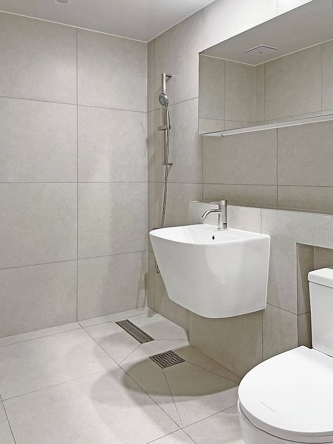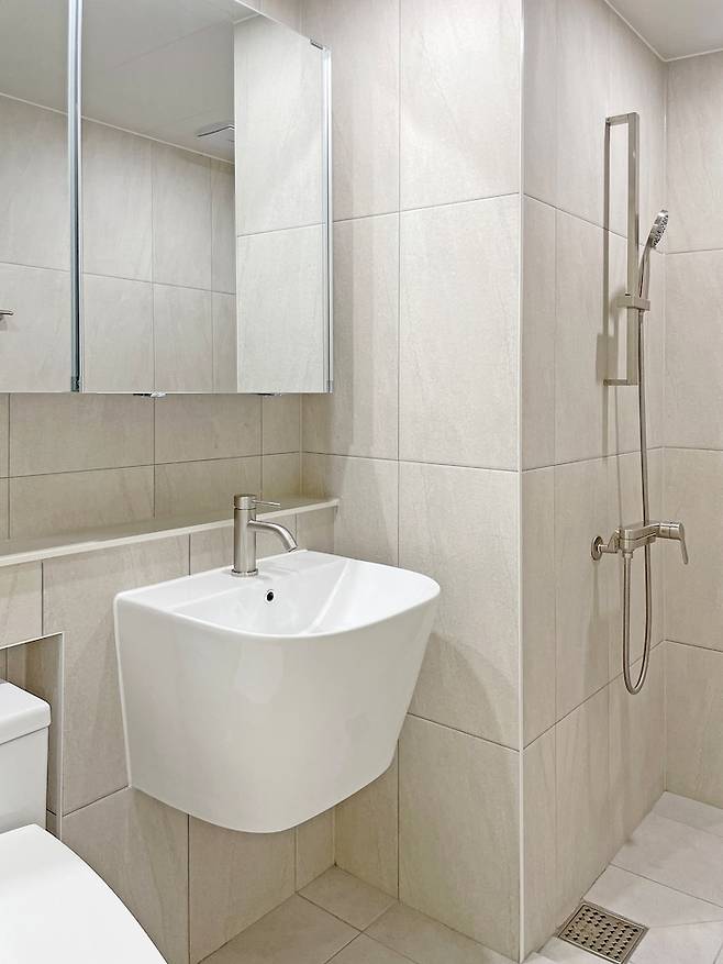 공용 화장실은 기존에 욕조를 제거하고 샤워 부스로 변경했어요. 두 곳 다 샤워 공간을 구분하는 유리벽을 다느냐 조적을 하느냐.. 고민 많았지만 조적을 하기엔 좁고 유리벽은 기존에 써봐서 알지만 있어도 그다지…만족스럽지 않고 청소가 너무 힘들다...