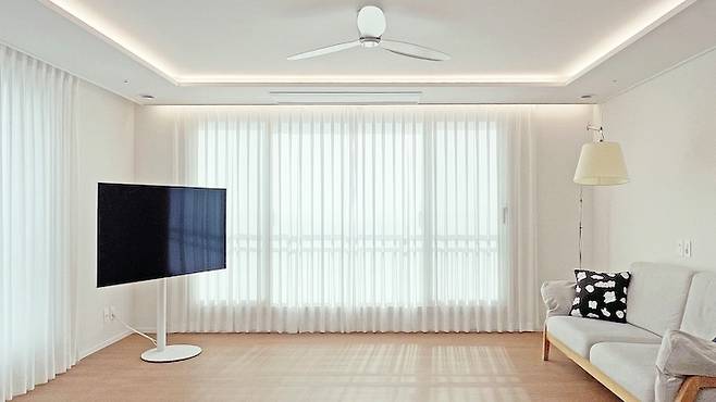 개인적으로 거실에 타공 등을 많이 뚫는 게 취향이 아니라서 고민하던 중 업체에서 라인 등을 추천해 주셔서 설치했어요. 커튼 박스 쪽이랑 우물천장 등이랑 따로 조절할 수 있게 설치해 주셨는데 증맬루 좋슴다…