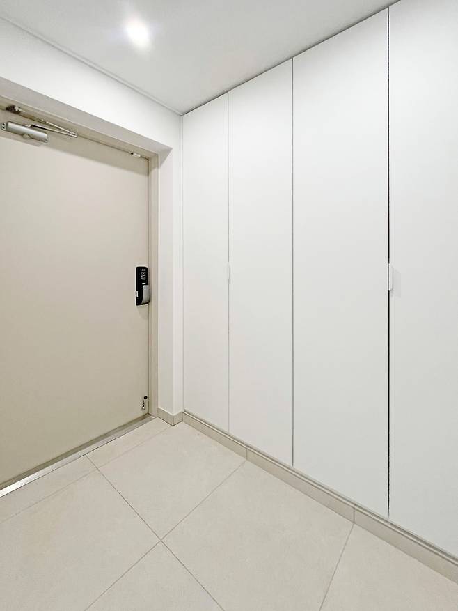 풍수적으로 현관은 깔끔해야 한다고 하여 주방 벽과 동일한 밝은 미색의 600각 타일로 마무리했어요. 장점은 밝고 넓어 보인다. 단점이 있다면 청소를 자주 해야 합니다. 비오는 날이면 발바닥 얼룩이 잘 보여요…후훗