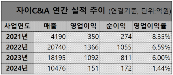 자이C&A의 연간 실적은 LG와의 거래가 정점을 찍었던 2022년 매출 2조740억원, 영업이익 1366억원을 각각 기록했다. 하지만 2024년에는 매출 1조476억원, 영업이익 151억원 등으로 급감했고 영업이익률은 1.44%에 불과했다. 2022년 계열분리 이후로 캡티브가 급감하면서 실적이 주춤해지자 수주채널 다변화를 위해 LG전자와 공동영업에 나선 것으로 풀이되는 대목이다.