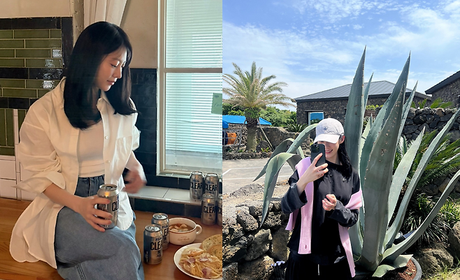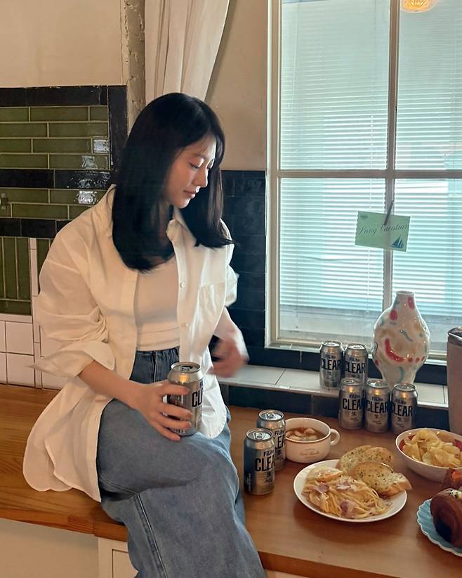 실내에서 공승연은 베이지 컬러의 오버사이즈 셔츠와 데님 팬츠로 편안한 홈웨어 스타일을 연출하고 있다. 셔츠의 루즈한 핏과 자연스럽게 흘러내린 실루엣이 여유로운 분위기를 자아내며, 캔 음료와 간식이 놓인 테이블 앞에서 일상적이면서도 감각적인 라이프스타일을 보여주고 있다.